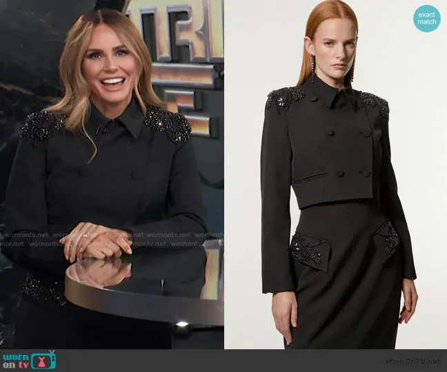Keltie Knight on E! News on E! was spotted wearing this black embellished jacket and skirt on E! News on Feb 26 2025's episode. Keltie's Jacket is the Crystal Embellished Tailored Double Breast Jacket by Karen Millen . Keltie's Skirt is the Embellished Tailored Pocket Detail Maxi Skirt by Karen Millen.