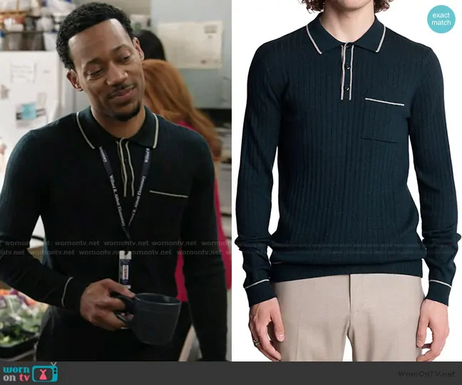 Gregory Eddie (played by Tyler James Williams) on Abbott Elementary on ABC was spotted wearing this ribbed long sleeve polo on Abbott Elementary on episode '100th Day of School' (4x15) in Feb 2025. Gregory's Shirt is the Tipped Long-Sleeve Polo Shirt by Paisley & Gray.