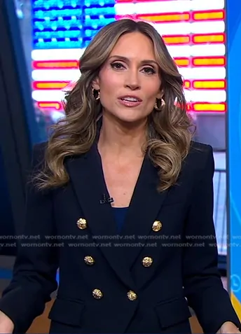 Rhiannon Ally on Good Morning America on ABC was spotted wearing this navy blazer with gold buttons on Good Morning America on Nov 12 2025's episode. Rhiannon's Jacket is the Miller Dickey Jacket in Navy with Gold Buttons by Veronica Beard.