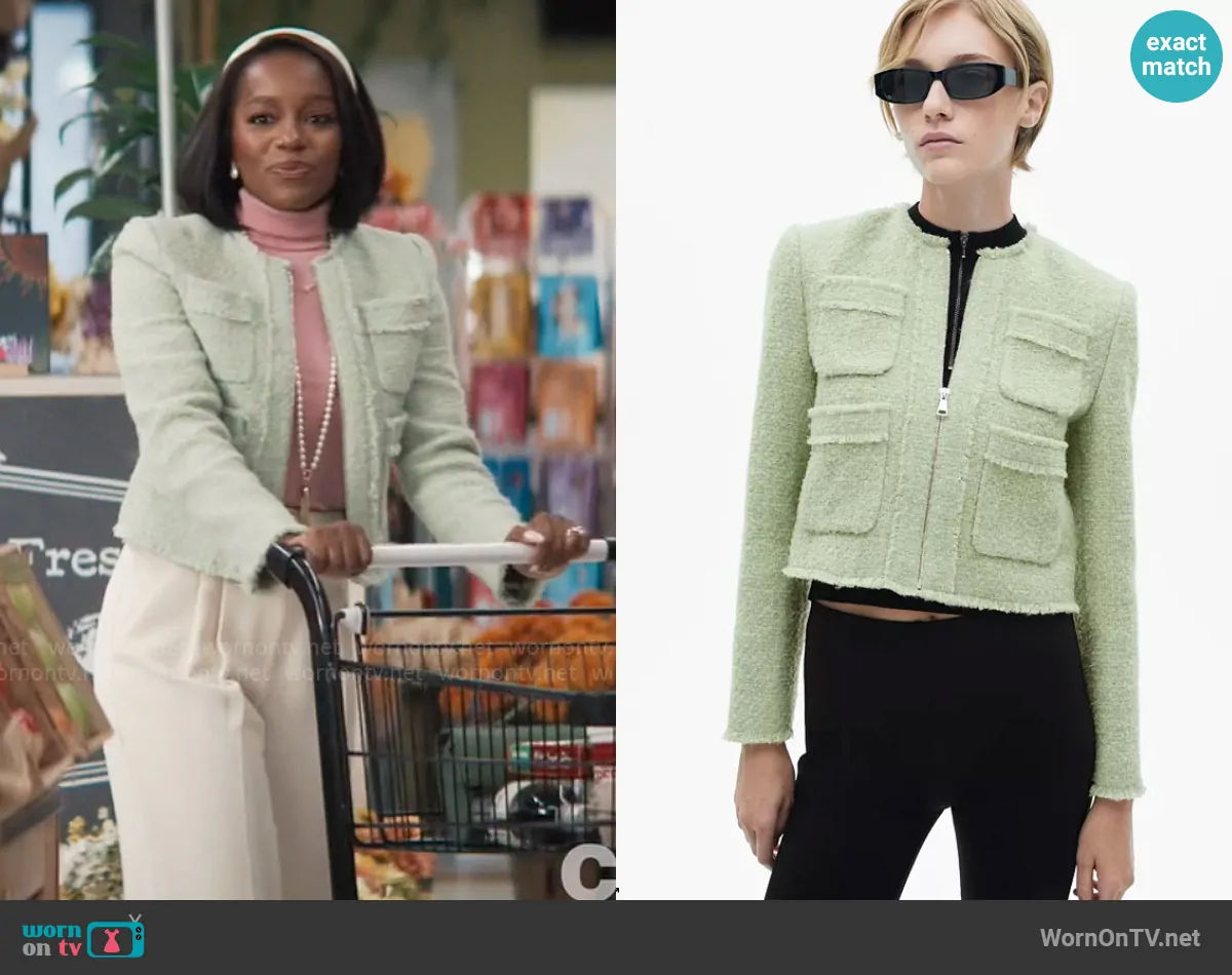 Catherine (played by Aja Naomi King) on Grosse Pointe Garden Society on NBC was spotted wearing this mint green tweed jacket on Grosse Pointe Garden Society on episode 'Pests' (1x02) in Mar 2025. Catherine's Jacket is the Zipper Detail Tweed Jacket by Mango.