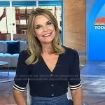 Savannah Guthrie on Today on NBC was spotted wearing this navy stripe short sleeve cardigan on Today on Aug 11 2025's episode. Savannah's Sweater is the Keenan Striped Short-Sleeve Cardigan by G. Label.