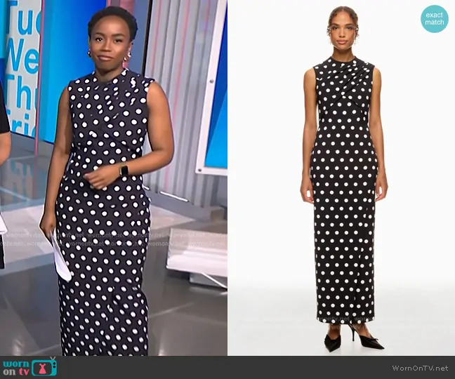 Zinhle Essamuah on NBC News Daily on NBC was spotted wearing this black polka dot sleeveless dress on NBC News Daily on Mar 04 2025's episode. Zinhle's Dress is the Celeste Gown by Et Ochs.