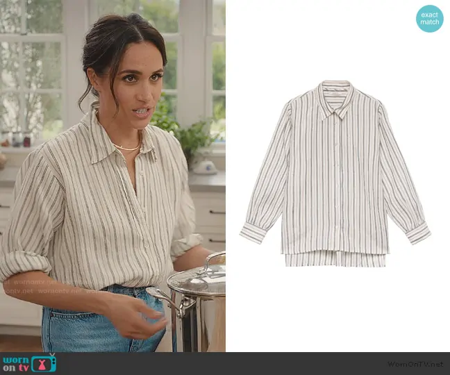 Meghan Markle on With Love Meghan on Netflix was spotted wearing this striped linen blouse on With Love Meghan on episode 'Two Kids from LA' (1x03) in Mar 2025. Meghan's Top is the Hava Top in Leone Stripe by Doen.