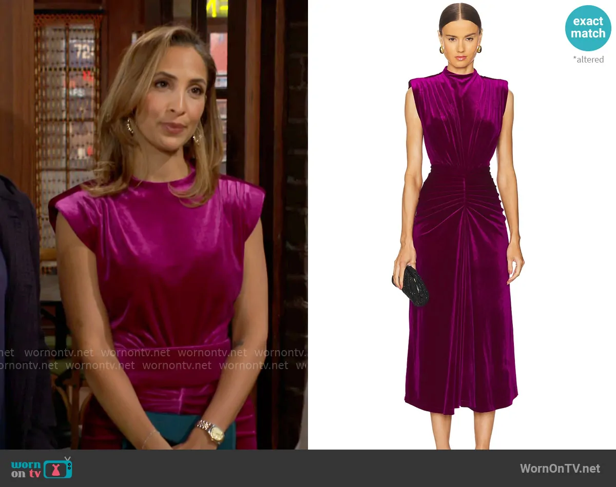 Lily Winters (played by Christel Khalil) on The Young and the Restless on CBS was spotted wearing this pink velvet dress on The Young and the Restless on Mar 06 2025's episode. Lily's Dress is the Al Dress in Dark Fuchsia by Saylor .