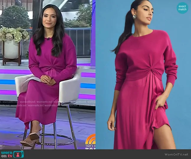 Emilie Ikeda on Today on NBC was spotted wearing this magenta mixed media dress on Today on Nov 03 2025's episode. Emilie's Dress is the The Gemini Twofer Sweater + Dress Set by Anthropologie.