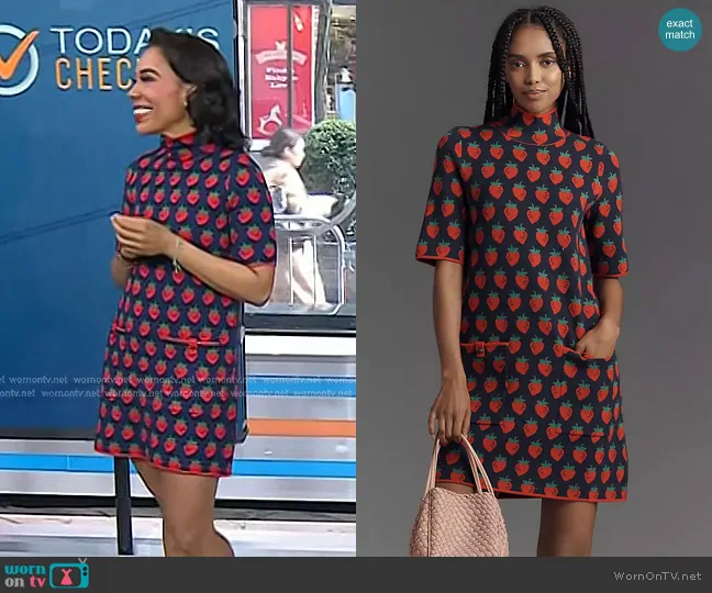 on Today on NBC was spotted wearing this strawberry print dress on Today on Mar 06 2025's episode. 's Dress is the The Annalise Mock-Neck Mini Sweater Dress by Maeve.