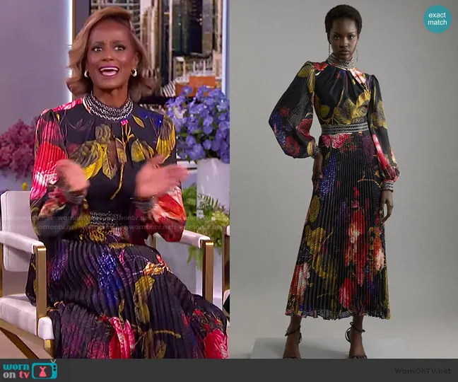 on The Jennifer Hudson Show on FOX was spotted wearing this black floral print maxi dress on The Jennifer Hudson Show on Feb 26 2025's episode. 's Dress is the Diamante Trim Floral Woven Maxi Dress by Karen Millen.