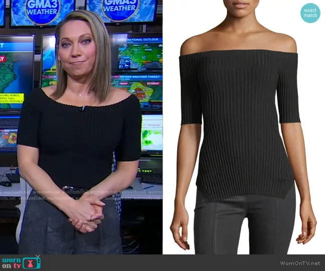 Helmut Lang Off-the-Shoulder Short-Sleeve Ribbed Silk Top worn by Ginger Zee on Good Morning America