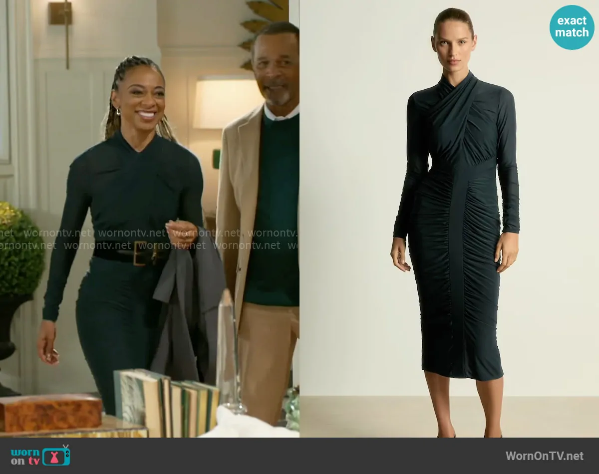 Linda (played by Nischelle Turner) on Beyond the Gates on CBS was spotted wearing this teal ruched dress on Beyond the Gates on Mar 11 2025's episode. 's Dress is the Myla Dress in Teal by Reiss.