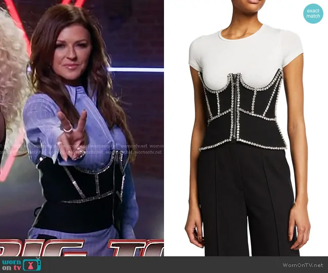 on The Voice on NBC was spotted wearing this rhinestone embellished corset and lave leggings on The Voice on Mar 11 2025's episode. 's Top is the Crystal-Stitched Cutout Corset by Area . 's Leggings is the Cassia Capri Leggings by Beaufille.