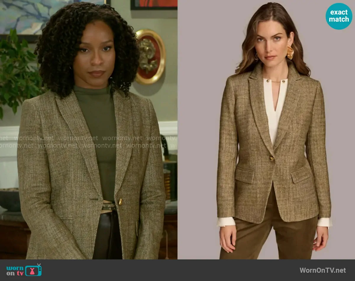 Naomi Hamilton Hawthorne (played by Arielle Prepetit) on Beyond the Gates on CBS was spotted wearing this tweed blazer on Beyond the Gates on Mar 11 2025's episode. Naomi's Jacket is the Textured One-Button Jacket by Donna Karan.
