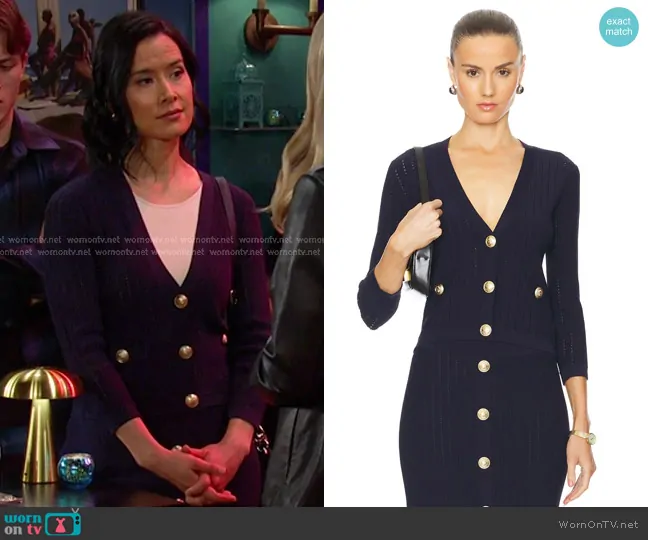Amy Choi (played by Shi Ne Nielson) on Days of our Lives on Peacock was spotted wearing this navy cardigan and knit skirt with gold buttons on Days of our Lives on Mar 13 2025's episode. 's Sweater is the Irwin Pointle Cropped Cardi in Midnight by L'Agence . 's Skirt is the Melania Pointle Knit Skirt in Midnight by L'Agence.