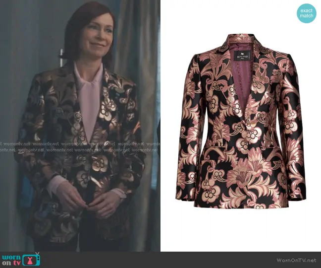 Elsbeth Tascioni (played by Carrie Preston) on Elsbeth on CBS was spotted wearing this metallic floral blazer on Elsbeth on episode 'I See … Murder' (2x15) in Mar 2025. Elsbeth's Jacket is the Paisley Metallic Blazer in Multicolor Pink Base by Etro.