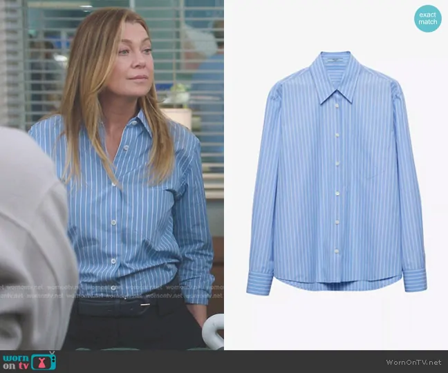 Meredith Grey (played by Ellen Pompeo) on Greys Anatomy on ABC was spotted wearing this blue striped button down shirt on Greys Anatomy on episode 'Jump (for My Love)' (21x10) in Mar 2025. Meredith's Top is the Stripe-motif Cotton-poplin Shirt by Prada.