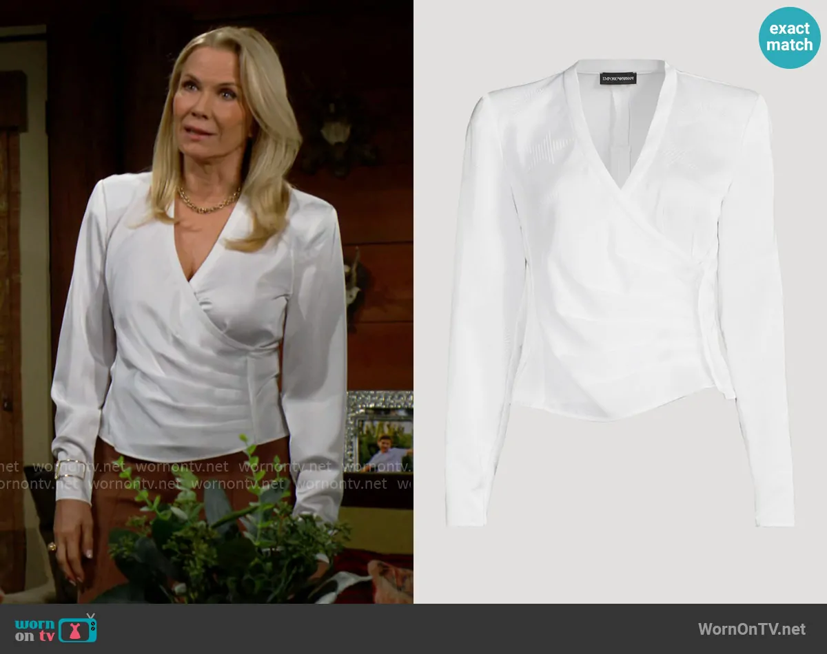 Brooke Logan (played by Katherine Kelly Lang) on The Bold and the Beautiful on CBS was spotted wearing this white faux-wrap top on The Bold and the Beautiful on Mar 14 2025's episode. Brooke's Top is the Wrap-Front Satin Blouse by Emporio Armani . Brooke's Necklace is the Pavé Chain Link Necklace by Baublebar.