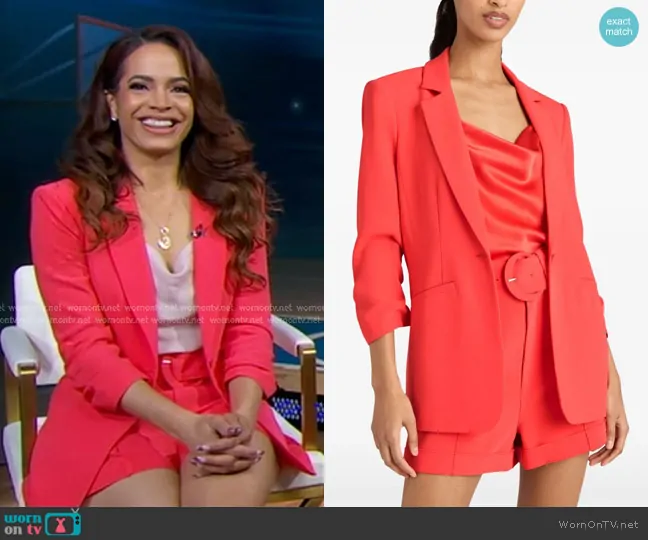 on Good Morning America on ABC was spotted wearing this pink blazer and belted shorts on Good Morning America on Mar 17 2025's episode. 's Jacket is the Khloe Ruched-Cuff Blazer by Cinq a Sept . 's Shorts is the Aldi Belted Shorts by Cinq a Sept.