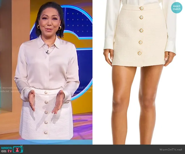 Stephanie Ramos on Good Morning America on ABC was spotted wearing this white button front tweed skirt on Good Morning America on Mar 17 2025's episode. Stephanie's Skirt is the Textured Button Front Miniskirt by French Connection.