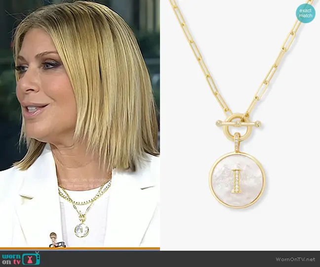 Jill Martin on Today on NBC was spotted wearing this gold pendant necklace on Today on Mar 17 2025's episode. Jill's Necklace is the Love Letters Medallion Necklace in Gold by Melinda Maria . Jill's Necklace is the The Queen's Tennis Necklace 16" by Melinda Maria.