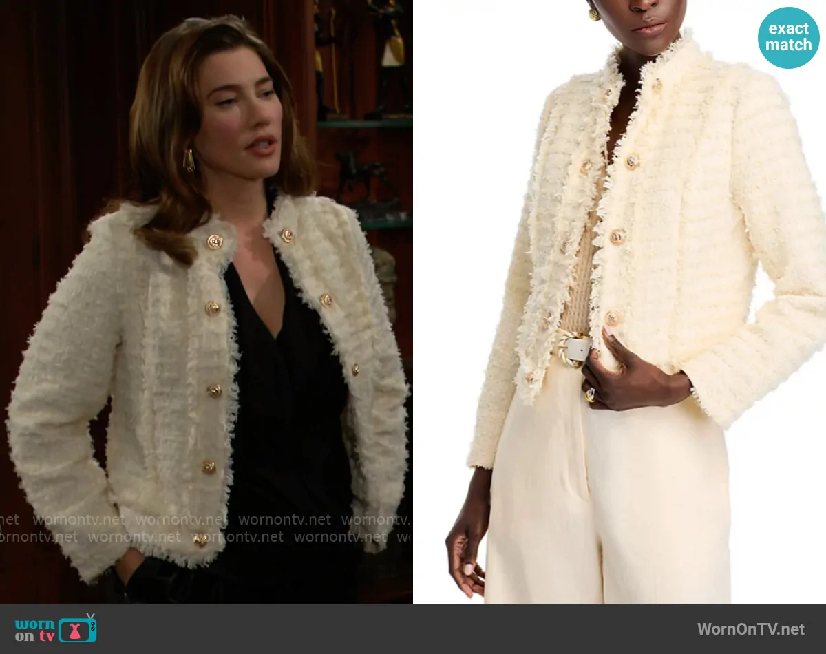 Steffy Forrester (played by Jacqueline MacInnes Wood) on The Bold and the Beautiful on CBS was spotted wearing this cream tweed jacket on The Bold and the Beautiful on Mar 19 2025's episode. Steffy's Jacket is the Fringe Tweed Jacket in Vanilla by Aqua .
