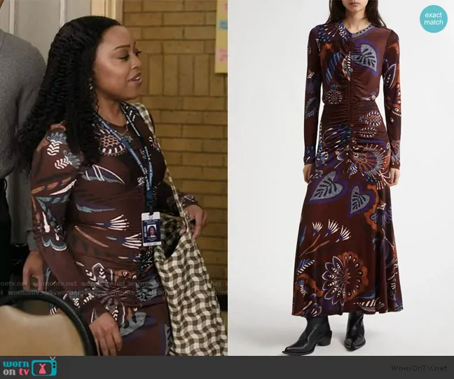 Janine Teagues (played by Quinta Brunson) on Abbott Elementary on ABC was spotted wearing this brown floral print mesh dress on Abbott Elementary on episode 'Audit' (4x18) in Mar 2025. Janine's Dress is the Floral Gathered Bodice Midi Dress by FARM RIO . Janine's Bag is the Zip Duck Twill Tote Bag by Baggu.