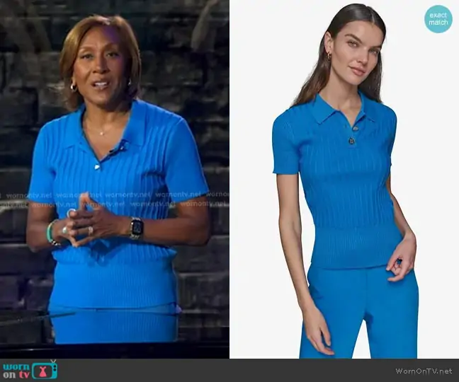 Robin Roberts on Good Morning America on ABC was spotted wearing this blue ribbed polo on Good Morning America on Sep 18 2025's episode. Robin's Top is the Knit Polo in French Blue by Karl Lagerfeld Paris.