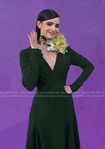 on Today on NBC was spotted wearing this green v-neck dress on Today on Mar 24 2025's episode. 's Dress is the Gathered Crepe Midi Dress in Forest Green by Elie Saab.