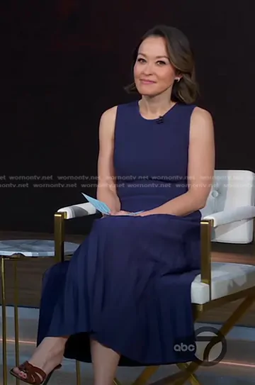 Eva Pilgrim on Good Morning America on ABC was spotted wearing this navy sleeveless pleated dress on Good Morning America on Mar 25 2025's episode. Eva's Dress is the Elyse Dress in Navy by Staud.
