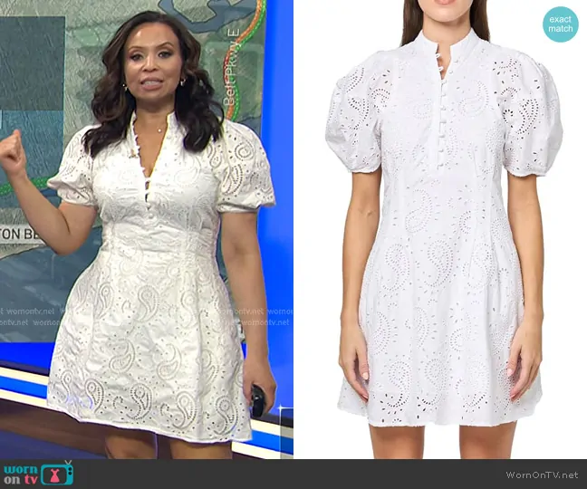 Adelle Caballero on Today on NBC was spotted wearing this white paisley eyelet dress on Today on Mar 26 2025's episode. Adelle's Dress is the Eyelet Balloon Sleeve Mini Dress by Club Monaco.