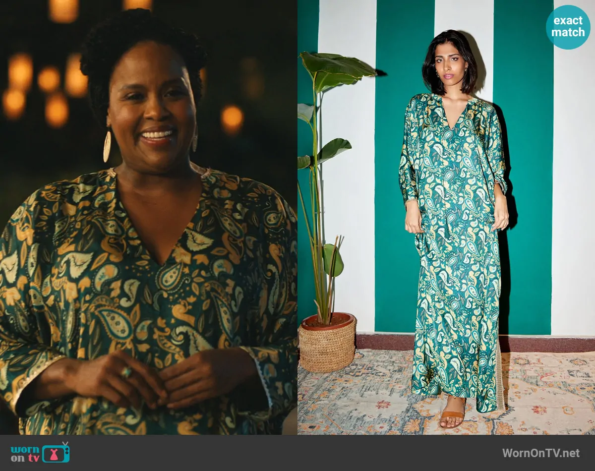 Belinda Lindsey (played by Natasha Rothwell) on The White Lotus on HBO was spotted wearing this green paisley print kaftan on The White Lotus on episode 'The Meaning of Dreams' (3x03) in Mar 2025. Belinda's Dress is the Hand Draped Kaftan in Emerald Paisley -Bemberg™ by Verandah.