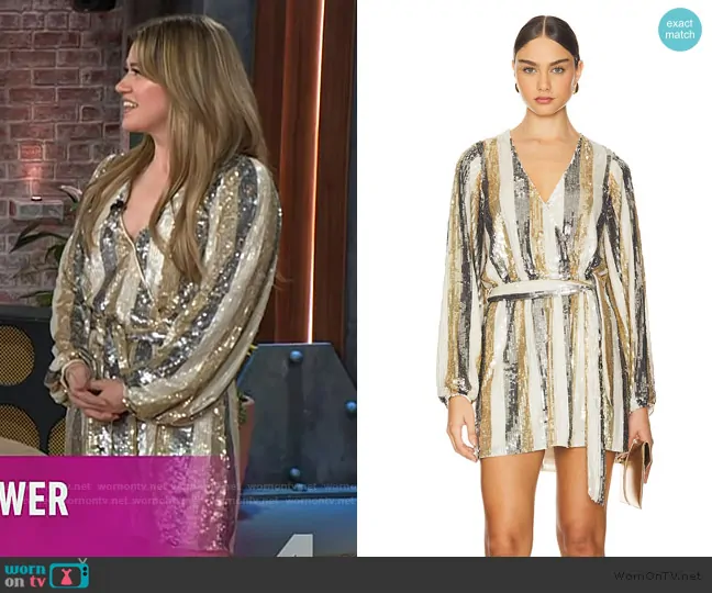 Kelly Clarkson on The Kelly Clarkson Show on NBC was spotted wearing this sequin stripe wrap mini dress on The Kelly Clarkson Show on Mar 31 2025's episode. Kelly's Dress is the Wear Me Out Dress by Show Me Your Mumu.