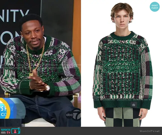 on Good Morning America on ABC was spotted wearing this knit sweater on Good Morning America on Apr 01 2025's episode. 's Sweater is the Float Jacquard Crewneck Sweater in Purple/Green by S.R. Studio.