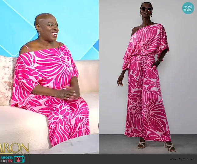 on Tamron Hall Show on ABC was spotted wearing this pink floral print cold shoulder jumpsuit on Tamron Hall Show on Apr 01 2025's episode. 's Jumpsuit is the Short Dolman Sleeve Floral Jumpsuit by New York and Company.