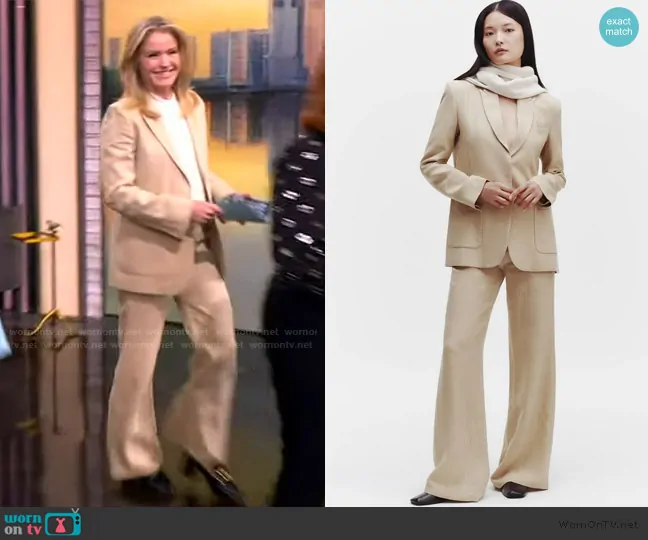 Sara Haines on The View on ABC was spotted wearing this beige linen blazer and pants on The View on Apr 02 2025's episode. Sara's Blazer is the Morgans Oversize Linen Blazer by TWP . Sara's Pants is the Howard Linen Wide Leg Pants by TWP.