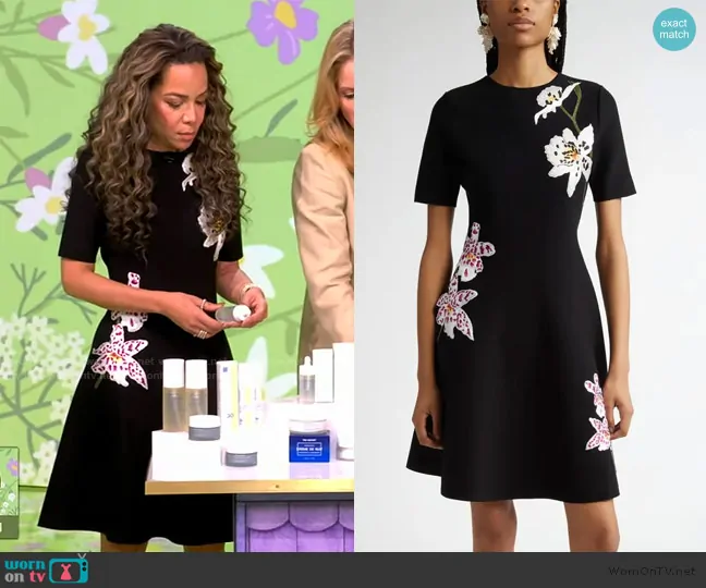Sunny Hostin on The View on ABC was spotted wearing this black floral embroidered mini dress on The View on Apr 02 2025's episode. Sunny's Dress is the Orchid Threadwork Fit & Flare Dress by Oscar de la Renta.