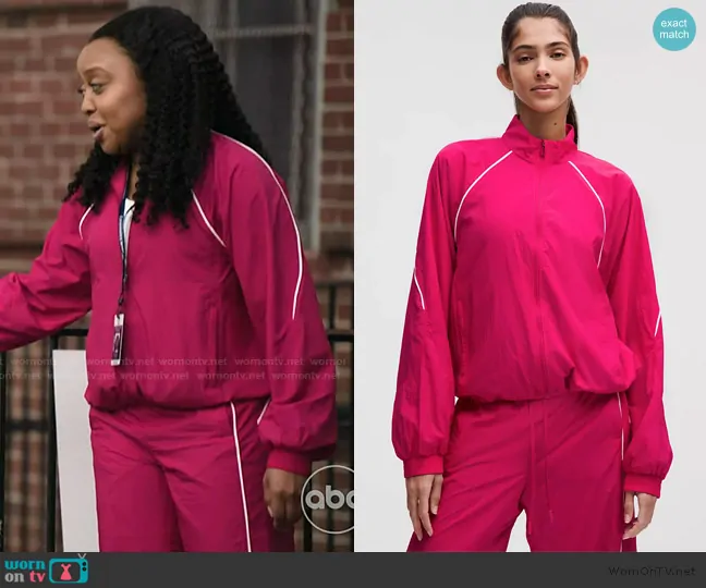 Janine Teagues (played by Quinta Brunson) on Abbott Elementary on ABC was spotted wearing this pink track Jacket and Pants on Abbott Elementary on episode 'Ava Fest: Tokyo Drift' (4x20) in Apr 2025. Janine's Jacket is the License to Train Lightweight Jacket by Lululemon . Janine's Pants is the License to Train Mid-Rise Lightweight Jogger by Lululemon.
