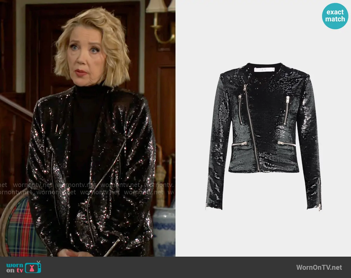 Nikki Reed Newman (played by Melody Thomas-Scott) on The Young and the Restless on CBS was spotted wearing this sequin jacket and skirt set on The Young and the Restless on Apr 03 2025's episode. Nikki's Jacket is the Luzia Sequined Moto Jacket in Dark Gray by IRO . Nikki's Skirt is the Sequin Midi Skirt by IRO.