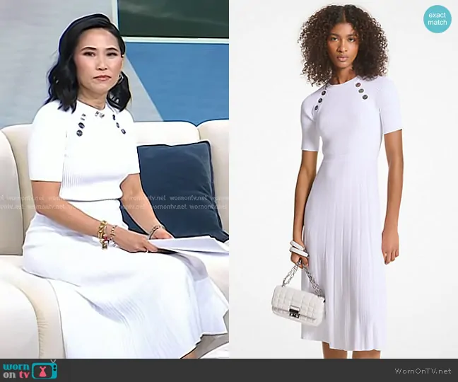 Vicky Nguyen on Today on NBC was spotted wearing this white ribbed button detail dress on Today on Jul 21 2025's episode. Vicky's Dress is the Ribbed Stretch Knit Button Midi Dress by MICHAEL Michael Kors.