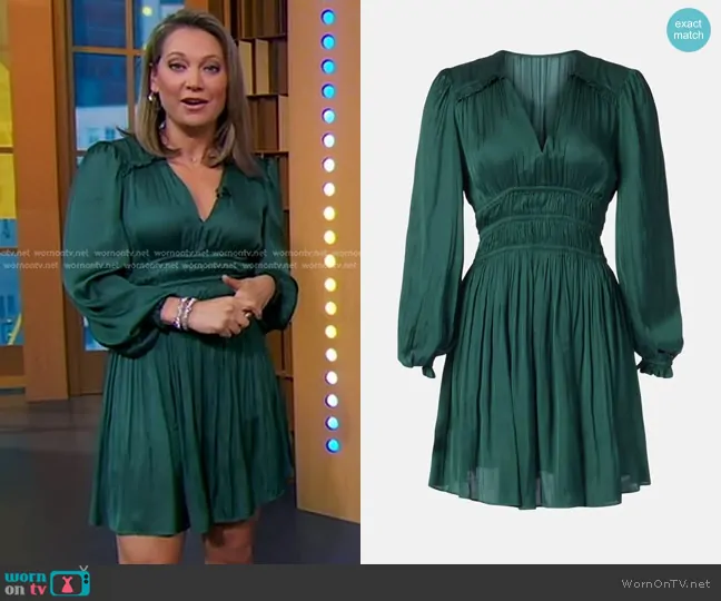 Ginger Zee on Good Morning America on ABC was spotted wearing this green smocked waist mini dress on Good Morning America on Apr 07 2025's episode. Ginger's Dress is the Smocked Ruffled Dress by Maje.
