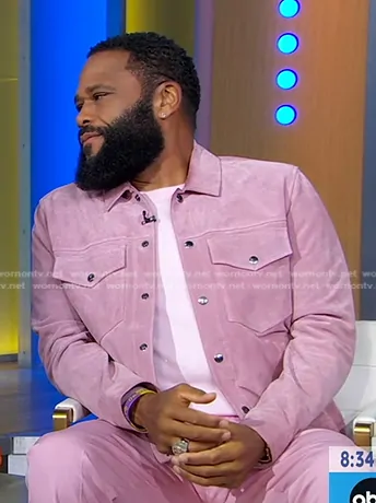 on Good Morning America on ABC was spotted wearing this Anthony Andersons’ pink suede jacket on Good Morning America on Apr 09 2025's episode. 's Jacket is the Italian Suede Snap Dylan Jacket in Lavender by Todd Snyder . 's Shoes is the Men's Oversized Sneaker in White/light Grey by Alexander McQueen.