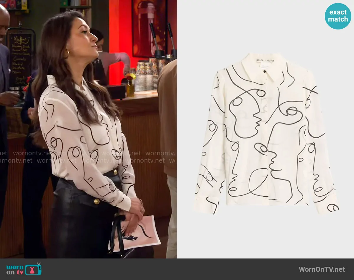 Lisa Chatsworth (played by Angelique Cabral) on The Neighborhood on CBS was spotted wearing this scribble print blouse and leather skirt on The Neighborhood on episode 'Welcome to the Sting' (7x16) in Apr 2025. 's Top is the Brady Slim Button-Front Silk Shirt by Alice + Olivia . 's Skirt is the Milann Faux Leather Midi-Skirt by L'Agence . 's Bag is the Liana Satchel by Karl Lagerfield Paris.