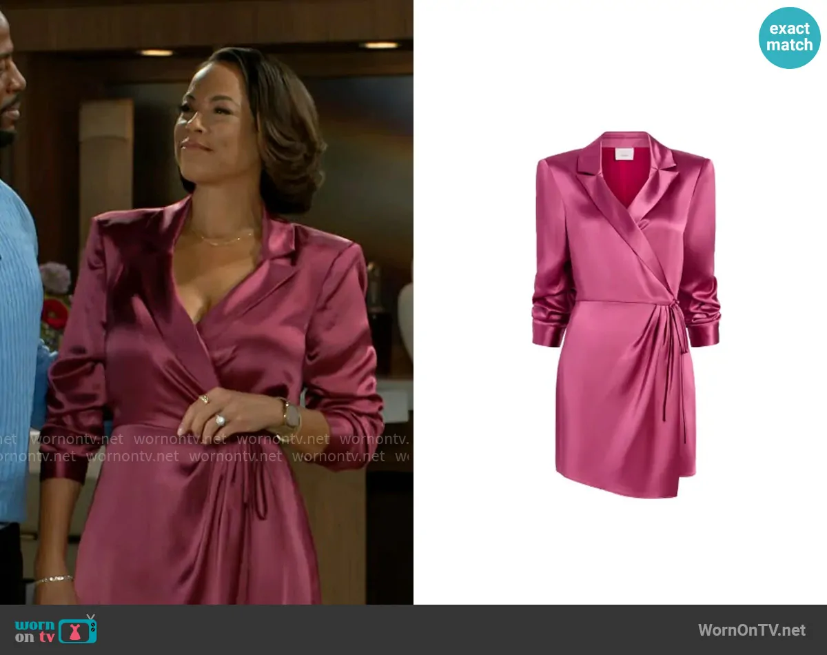 Nicole Dupree Richardson (played by Daphnee Duplaix) on Beyond the Gates on CBS was spotted wearing this pink satin wrap dress on Beyond the Gates on Apr 14 2025's episode. Nicole's Dress is the Sabina dress by Cinq a Sept.
