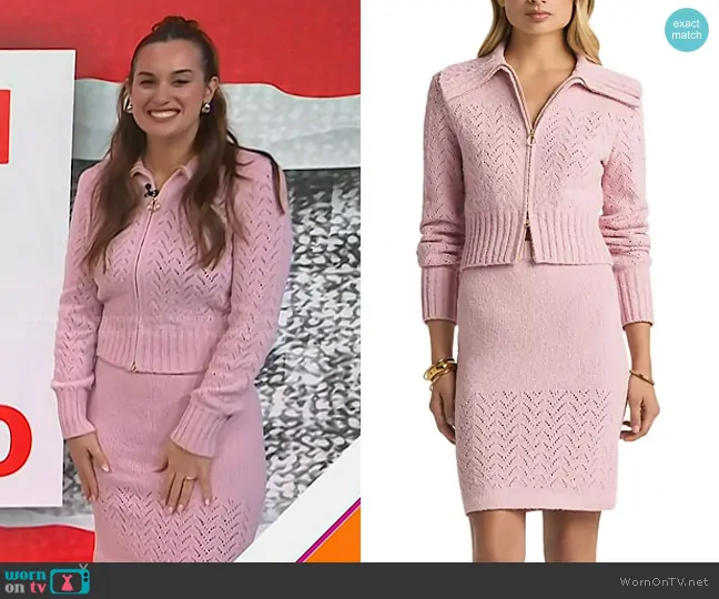 on Today on NBC was spotted wearing this pink pointelle zip sweater and skirt on Today on Apr 15 2025's episode. 's Sweater is the Chevron Zip Cardigan in Celi by St. John . 's Skirt is the Re Edition Chevron Skirt in Celi by St. John.
