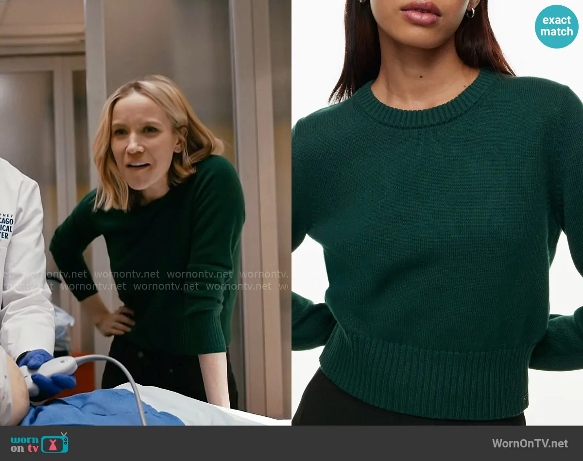 Hannah Asher (played by Jessy Schram) on Chicago Med on NBC was spotted wearing this dark green sweater on Chicago Med on episode 'Together One Last Time' (10x18) in Apr 2025. Hannah's Sweater is the Brendah Sweater in Scarab by Sunday Best at Aritzia.