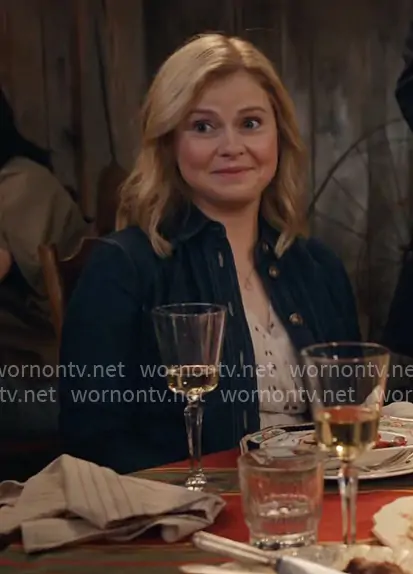 Sam (played by Rose McIver) on Ghosts on CBS was spotted wearing this denim shirt jacket on Ghosts on episode 'Viking Wedding' (5x02) in Oct 2025. Sam's Jacket is the Denim Cropped Buttoned-Down Blouse by RW&Co.