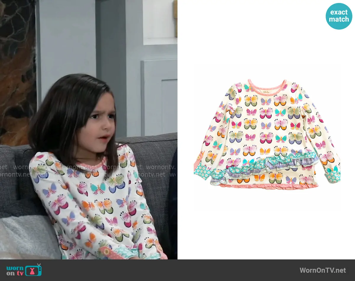 Donna Corinthos (played by Scarlett Spears) on General Hospital on ABC was spotted wearing this butterfly print top on General Hospital on Apr 17 2025's episode. 's Top is the Butterfly Top by Matilda Jane .