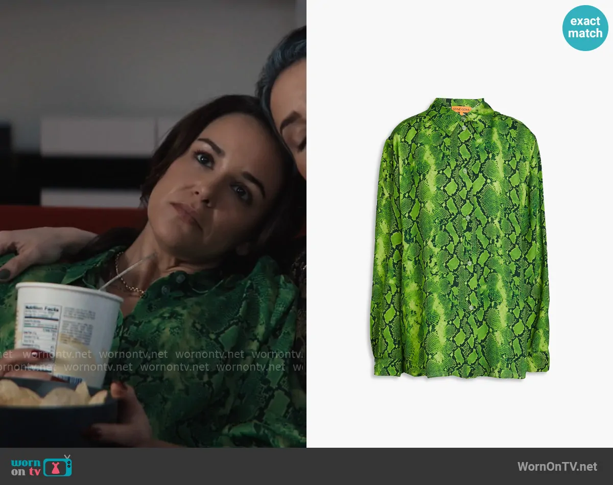Birdie (played by Melissa Fumero) on Grosse Pointe Garden Society on NBC was spotted wearing this green snake print shirt and pants set on Grosse Pointe Garden Society on episode 'The Cup' (1x09) in Apr 2025. Birdie's Top is the Sophia Shirt by Stine Goya . Birdie's Pants is the Fatou Pants by Stine Goya.