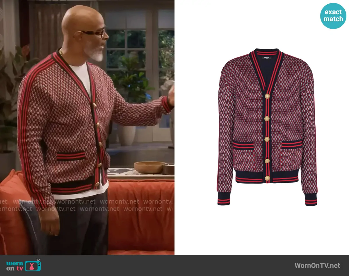 Poppa (played by Damon Wayans) on Poppas House on CBS was spotted wearing this red monogram print cardigan on Poppas House on episode 'Babygirl' (1x17) in Apr 2025. Poppa's Sweater is the Monogram-print checked wool cardigan by Balmain.