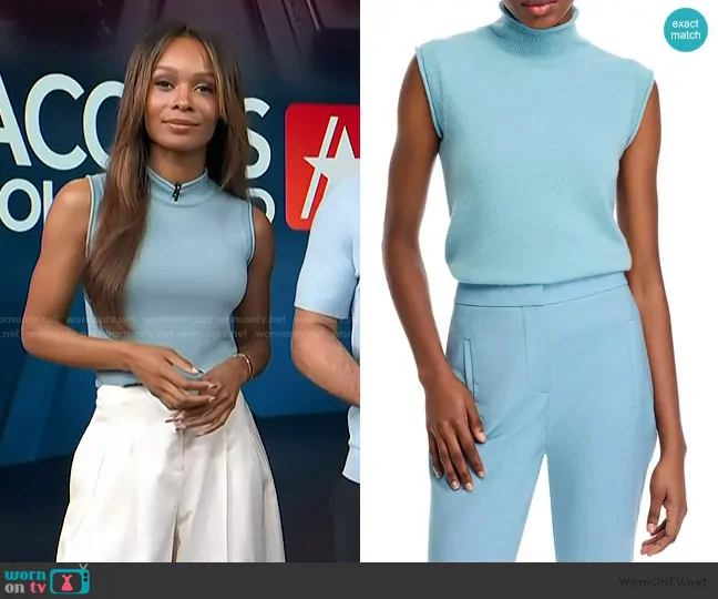 Zuri Hall on Access Hollywood on NBC was spotted wearing this blue mock neck top on Access Hollywood on Apr 22 2025's episode. Zuri's Top is the Mahalia Cashmere Pullover in Sea Glass by Veronica Beard.