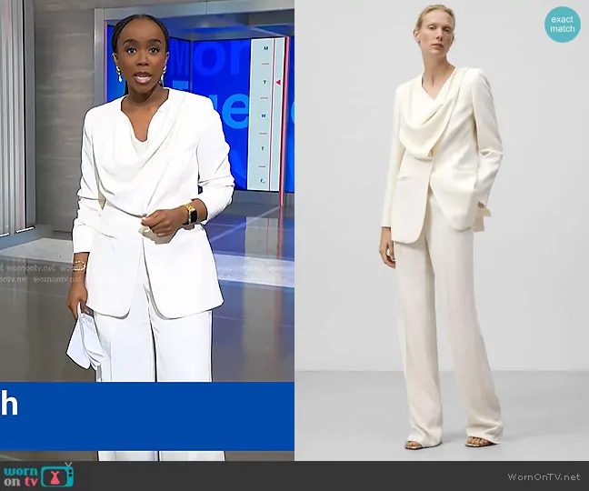 Zinhle Essamuah on NBC News Daily on NBC was spotted wearing this white draped blazer and pants on NBC News Daily on Apr 22 2025's episode. Zinhle's Jacket is the Blazer with Front Detail in Ecru by Adolfo Dominguez . Zinhle's Pants is the Straight Trousers in Ecru by Adolfo Dominguez.