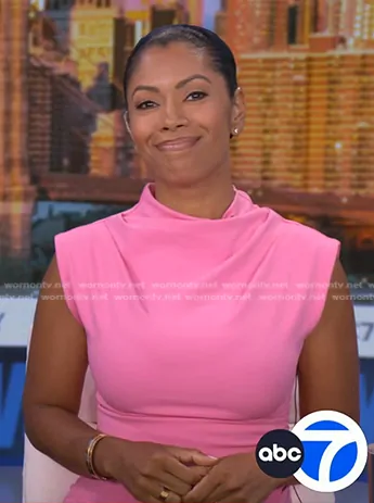 Shirleen Allicot on Good Morning America on ABC was spotted wearing this pink ruched dress on Good Morning America on Oct 23 2025's episode. Shirleen's Dress is the The Maya Ruched Cowl-Neck Dress by Anthropologie.